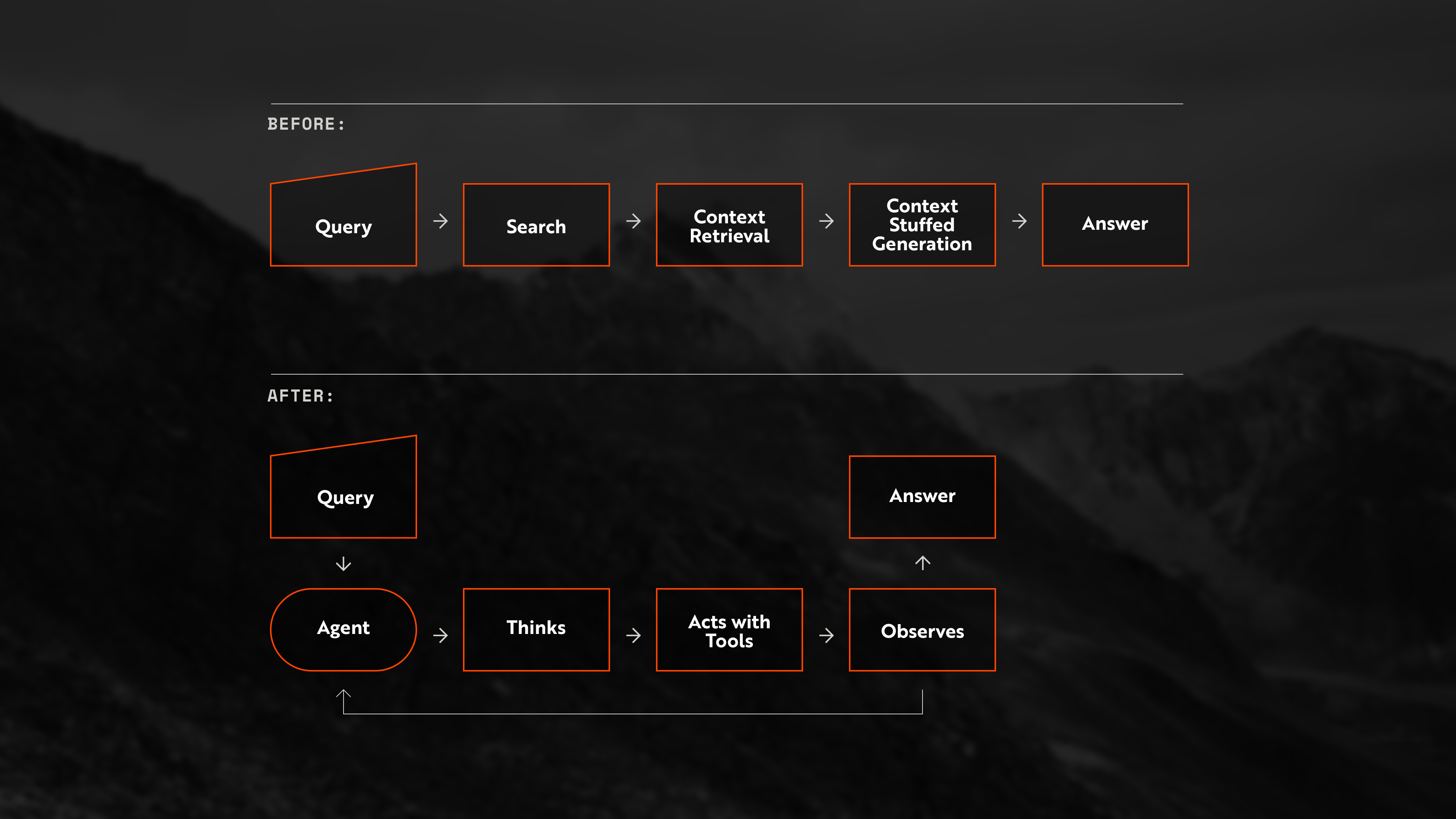 After: Agentic RAG uses search and document exploration tools, iterating until it has enough evidence to answer.